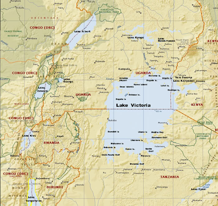 - Η Βικτορία( 68.422 τ.χλμ) είναι η μεγαλύτερη λίμνη της Αφρικής. Η πρωτεύουσα της Ουγκάντας Καμπάλα βρίσκεται στις όχθες της, ενώ χαρακτηριστικό της είναι τα πολλά νησιά περίπου 3.000!! Ιδιαίτερο επίσης ενδιαφέρον παρουσιάζουν οι περίφημοι καταρράκτες(108 μ. ύψος και 1,7 χλμ μήκος)